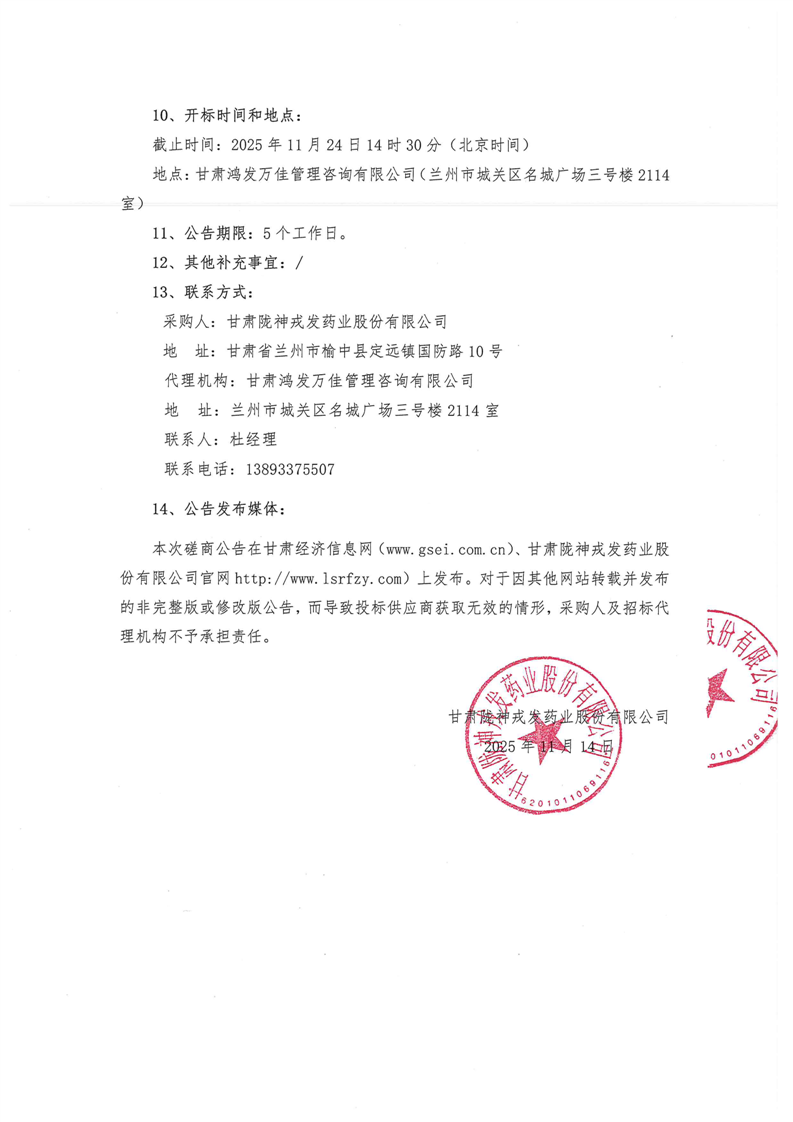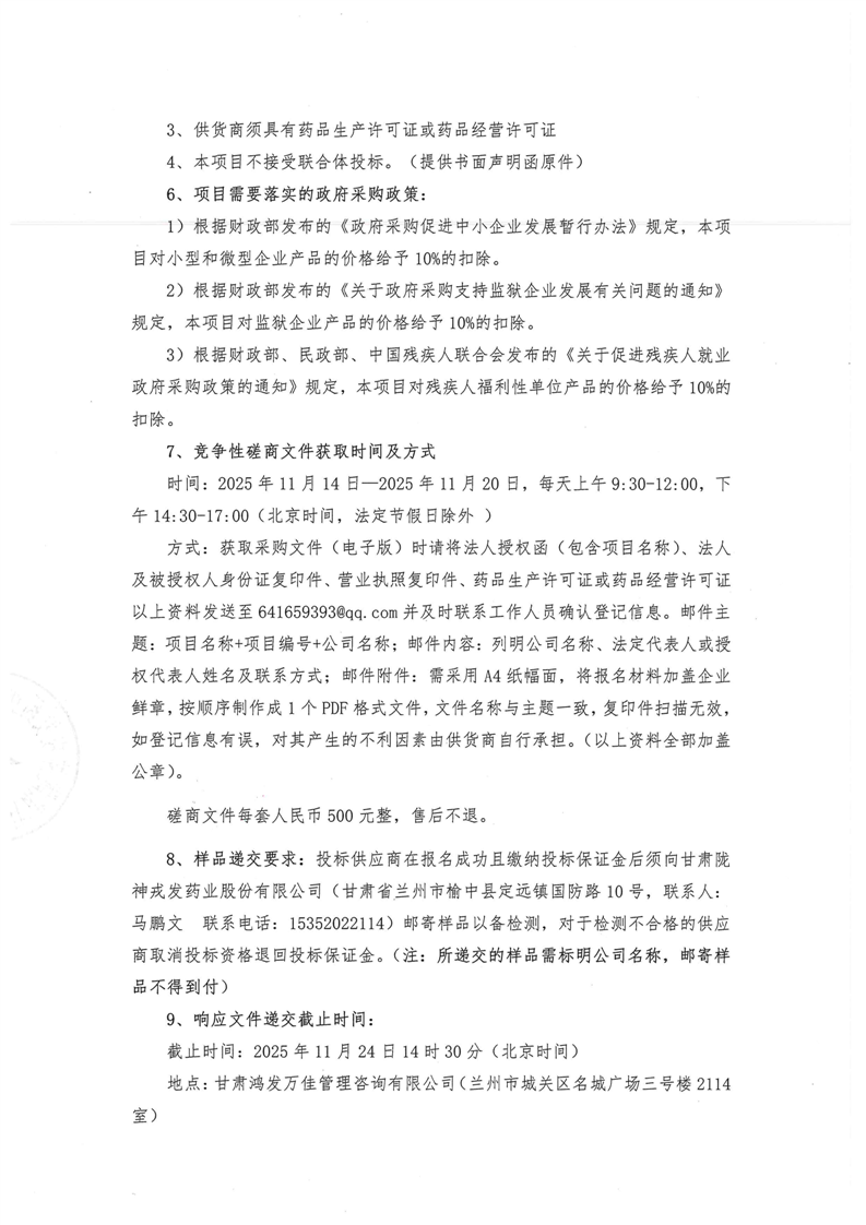 甘肃陇神戎发药业股份有限公司2025年11月白芷中药材采购项目竞争性磋商公告