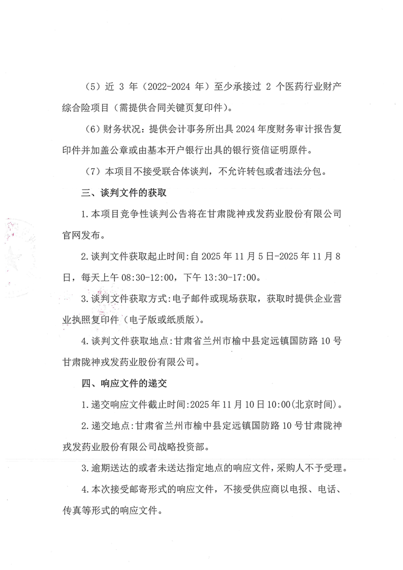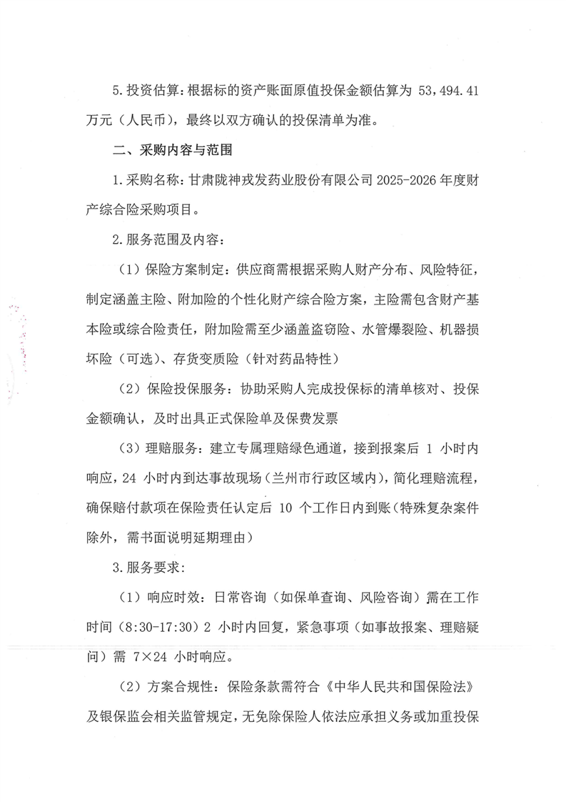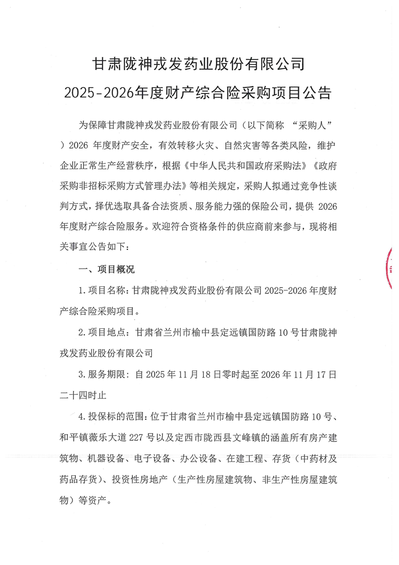 甘肃陇神戎发药业股份有限公司2025-2026年度财产综合险采购项目公告
