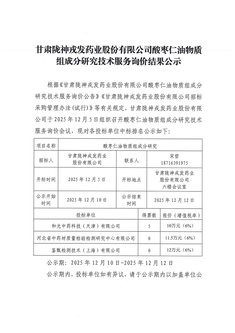 甘肃陇神戎发药业股份有限公司酸枣仁油物质组成分研究技术服务询价结果公示