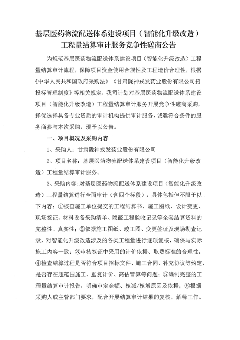 基层医药物流配送体系建设项目(智能化升级改造)工程量结算审计服务竞争性磋商公告