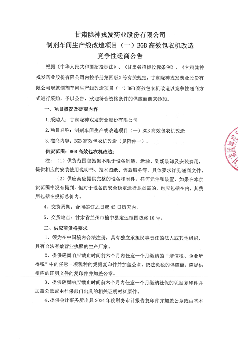 甘肃陇神戎发药业股份有限公司制剂车间生产线改造项目(一)BGB高效包衣机改造竞争性磋商公告