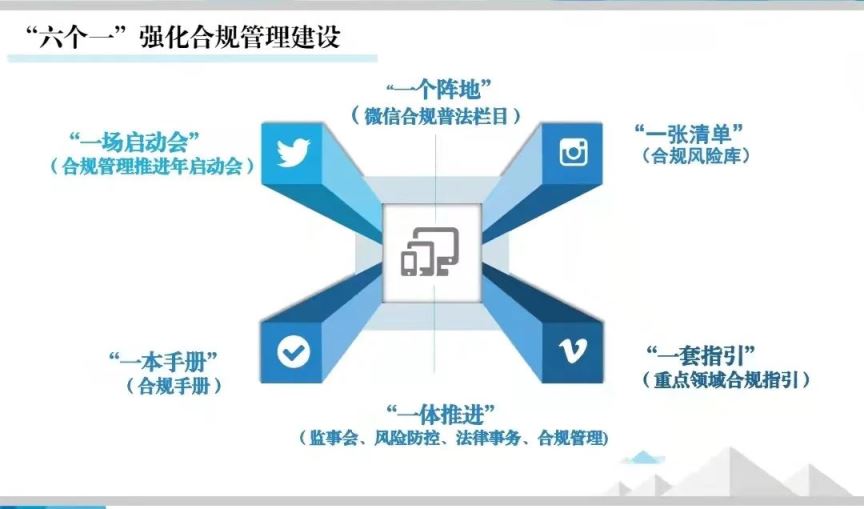 “一个阵地”——坚持用特色化、品牌化发展思路引领合规工作,加强合规文化品牌和阵地建设,充分运用微信公众平台创新打造法律合规学习阵地《法治强企》栏目,以“图片+视频+文字”的形式自制35期重点合规学习内容,内容涵盖企业投资并购、公司治理、合规管理等专题。目前,正在组织筹建“合规信息平台”,预计于五月上旬正式上线,作为日常合规管理、合规知识学习、合规指引应运、合规风险检索的基础平台。