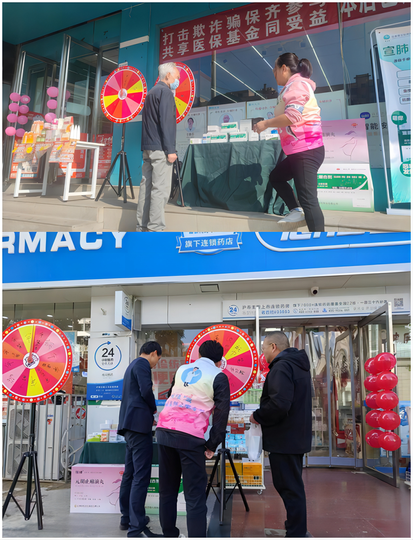 活动期间,学术部及三元医药OTC部的各位同事分工协作,在各药房门口放置药品展示台,来往行人顾客纷纷停下脚步,表示想转一转我们的爱心“大转盘”,参加小游戏,学习中医药小知识。