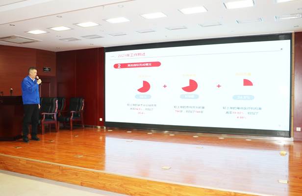 公司营销副总监史伟代表营销中心对2021年销售工作进行全面总结分析,并就2022年销售计划和保障措施向大会进行了报告。