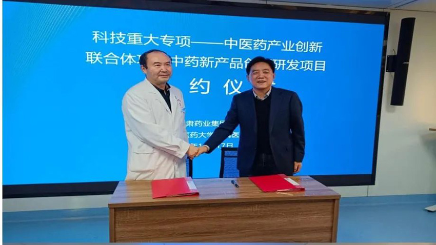 甘肃药业集团科技产业部部长、甘肃药业集团科技创新研究院董事长邱国玉与甘肃中医药大学附属医院院长谢兴文代表双方签署合作协议。