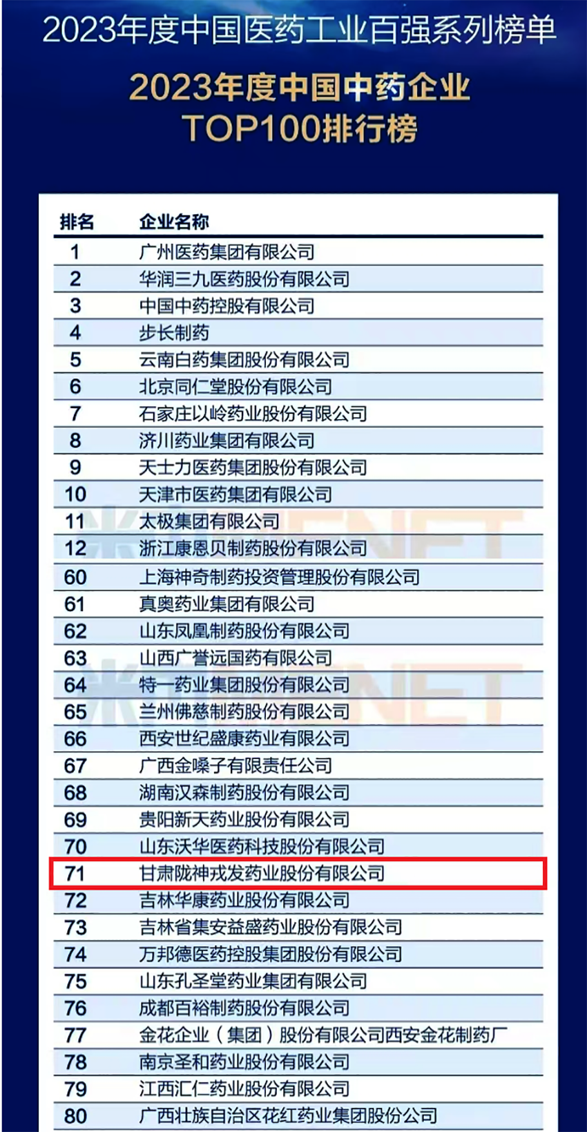 会上,“2023年度中国医药工业百强系列榜”重磅发布,共发布5大系列榜单和260家上榜企业。中国医药工业百强企业榜是国内公认的医药行业权威榜单,细分为“中国化药企业TOP100排行榜”、“中国中药企业TOP100排行榜”、“中国CXO企业TOP20排行榜”等5大子榜单,上榜企业是中国最具实力的医药工业企业,代表国内医药工业的发展水平,展示了中国医药工业百强企业的专业力和影响力。甘肃陇神戎发药业股份有限公司首次成功入选“2023年度中国中药企业 TOP100 排行榜”,位列第71位。获此殊荣的还有同为甘肃国投集团控股的兰州佛慈制药股份有限公司。