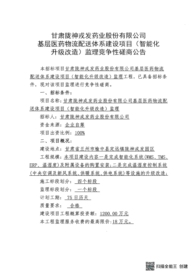甘肃陇神戎发药业股份有限公司基层医药物流配送体系建设项目(智能化升级改造)监理竞争性磋商公告