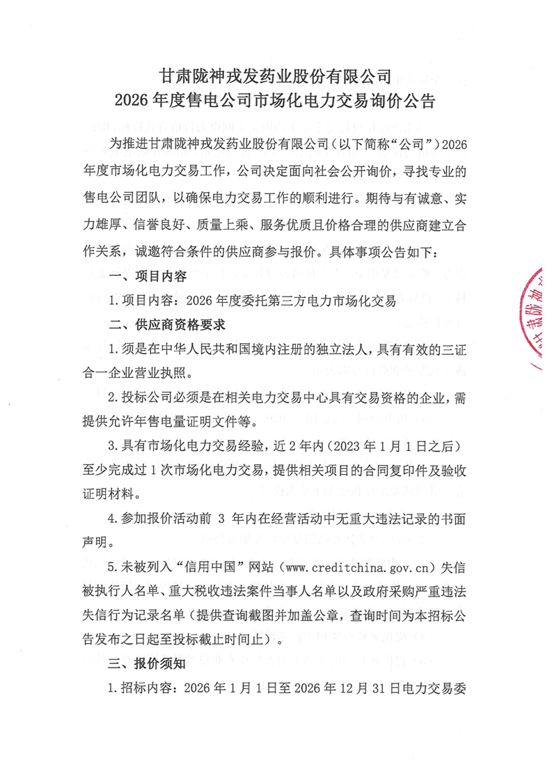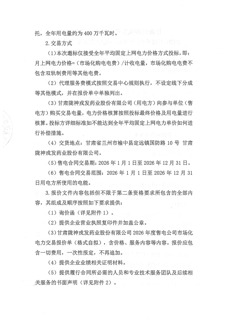 甘肃陇神戎发药业股份有限公司2026年度售电公司市场化电力交易询价公告