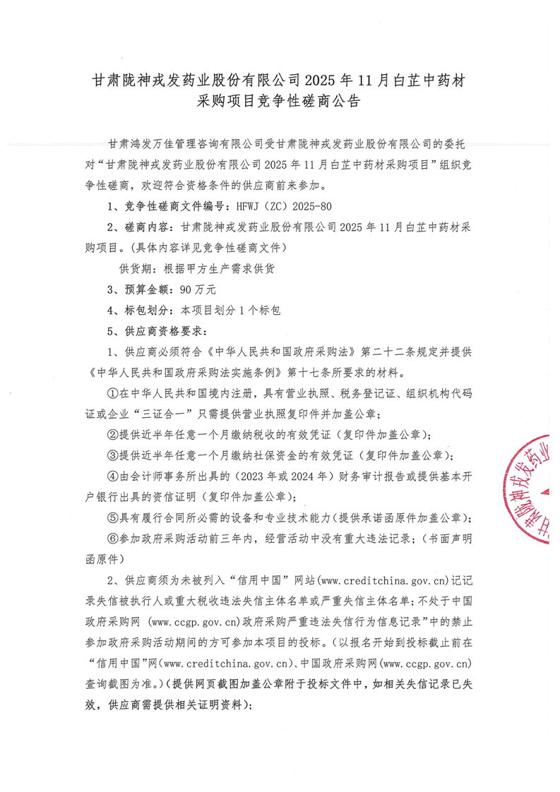 甘肃陇神戎发药业股份有限公司2025年11月白芷中药材采购项目竞争性磋商公告