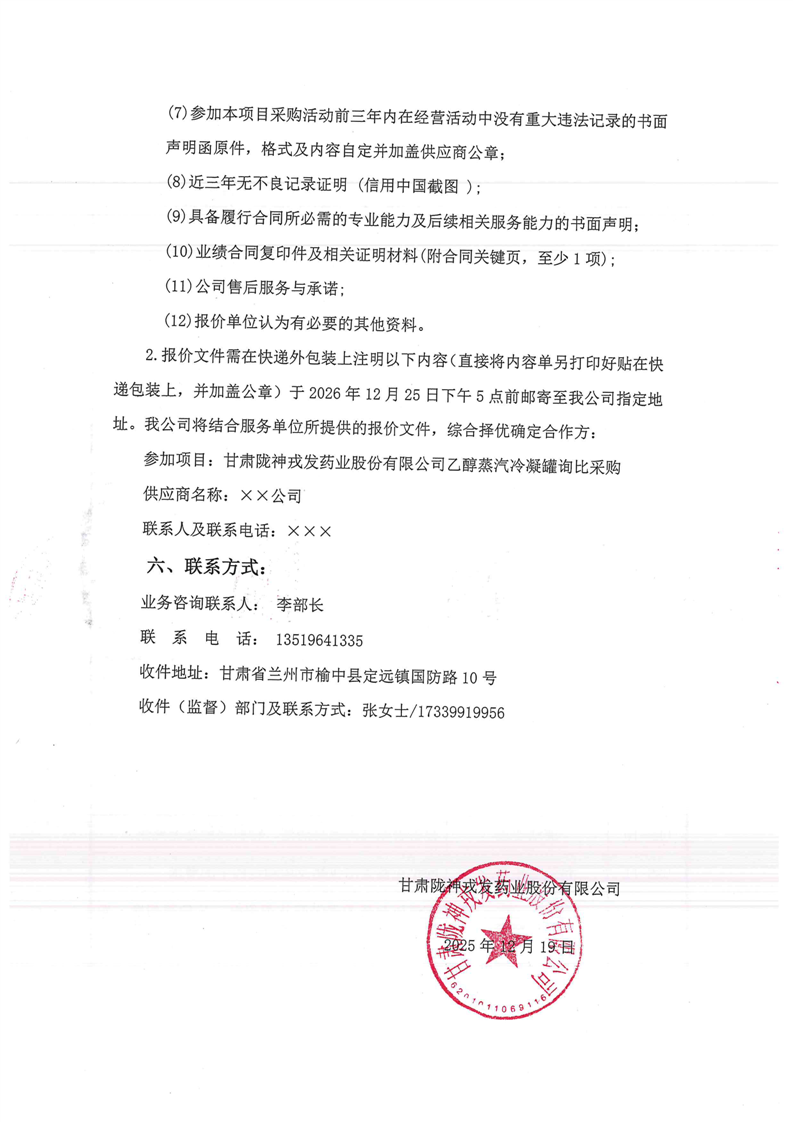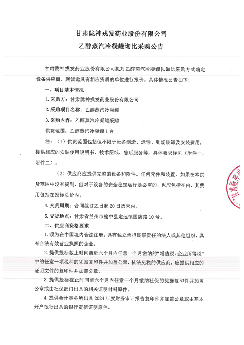 甘肃陇神戎发药业股份有限公司乙醇蒸汽冷凝罐询比采购公告