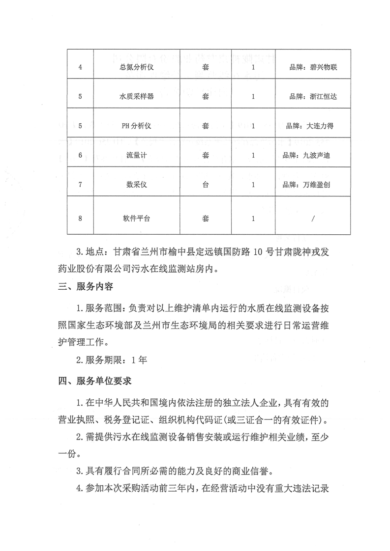 甘肃陇神戎发药业股份有限公司污水在线监测系统维保服务询比采购公告