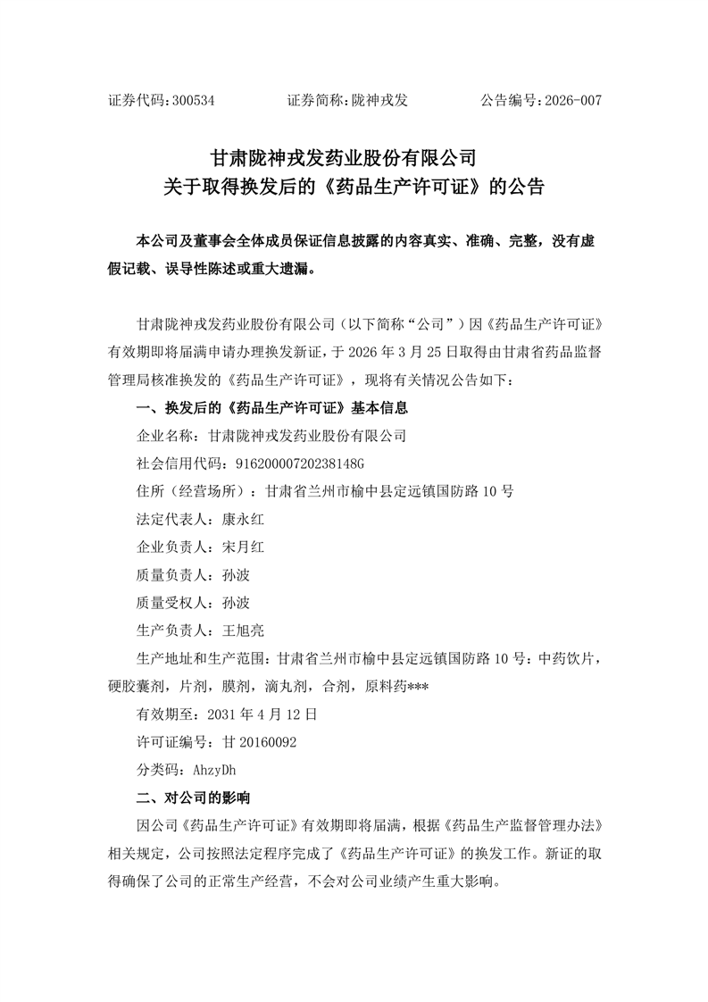 关于取得换发后的《药品生产许可证》的公告