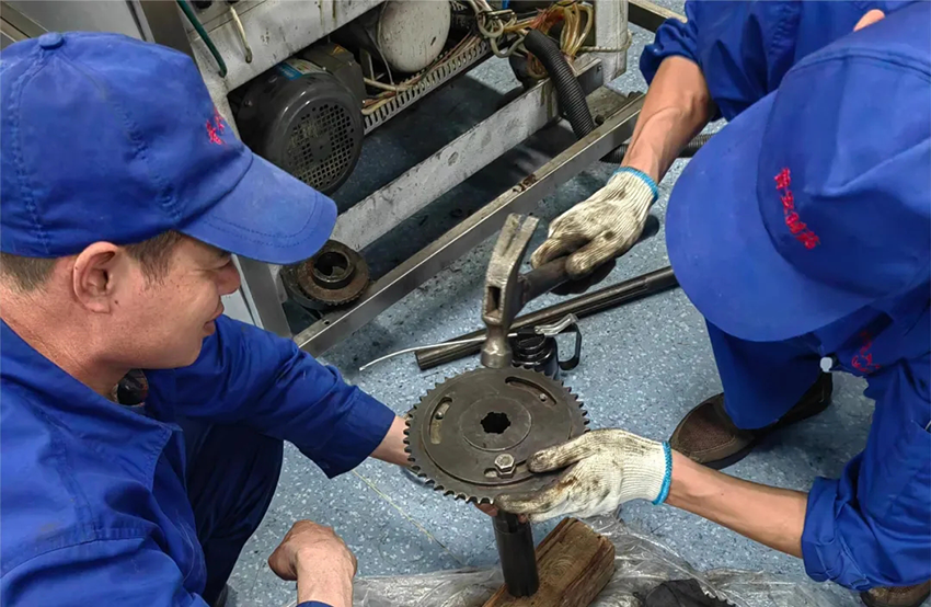 今年3月22日,外包车间原本正常运行的4号线装盒机突然发出与平时不一样的“呼喊声”,忙碌在生产线的班长杨禧和满天雁察觉不对,急忙来到故障设备处,发现装盒机运行不畅,出现夹盒现象,导致产品破损增加,于是马上通知4号线装盒工段停机,对故障设备进行拆解维修。经过多次查找探讨后,最终发现因装盒机运行时间过长导致链盘轮固定螺丝滑丝,链条移位。为尽快恢复生产,二人齐心协力,废寝忘食,埋头于拆解零件修理设备之间,经过不懈努力终于将设备修复,恢复正常生产,有效控制了质量成本。不知不觉过去了6个小时,这是生产现场平凡又紧张的一幕。