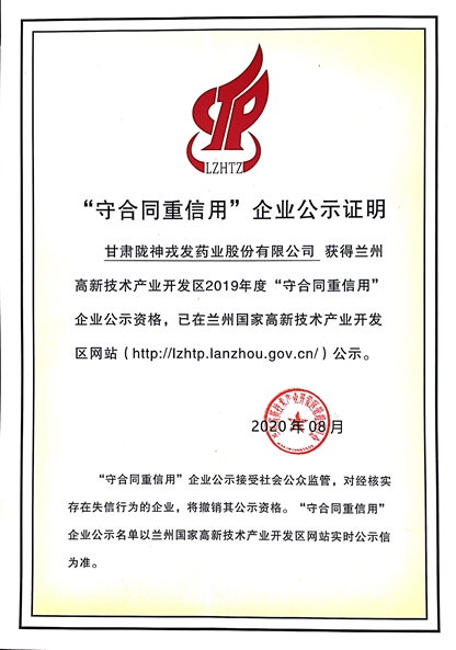 9月29日,兰州国家高新技术开业区“信用体系建设培训及‘守合同重信用’企业授牌仪式”在高新区科技孵化大厦隆重举行。陇神戎发获评“2019年度‘守合同重信用’企业”,并在高新区官方网站进行信用企业实时公示。