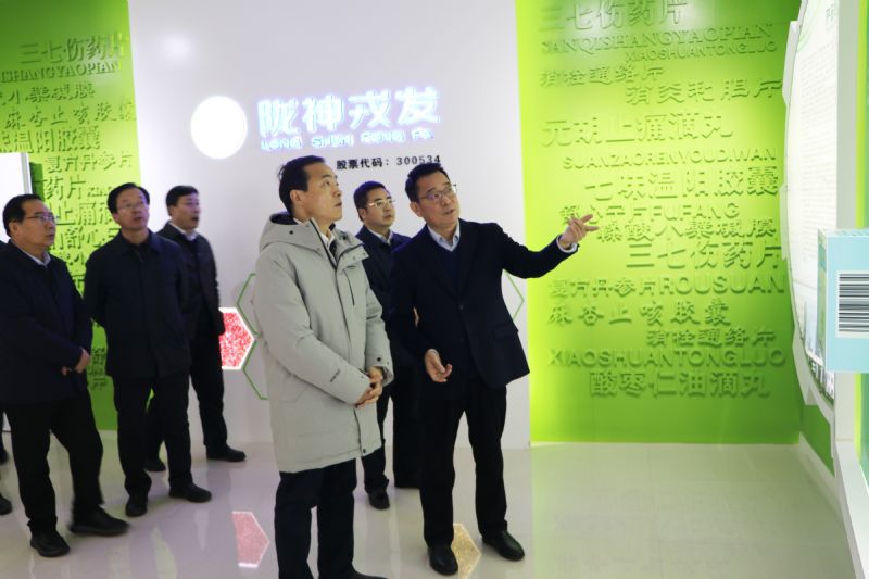 在陇神戎发产品展厅,康海军董事长向周学文常委介绍了公司主打产品元胡止痛滴丸等4个独家品种和其它普药品种,周学文常委重点关注了元胡止痛滴丸、麻杏止咳胶囊的生产工艺、生产过程及药效等问题,并通过观看生产监控室实时监控了解了陇神戎发制剂滴丸生产线及包装联动线。