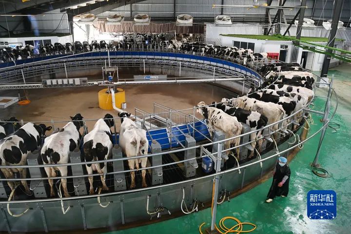 在武威市古浪县生态奶牛产业园的一家企业牧场,工作人员在转盘式挤奶机旁工作。