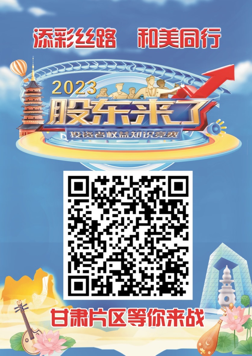 《股东来了》2023正式开赛,甘肃辖区首次作为主办赛区,亟待所有会员单位凝心聚力,化挑战为机遇,高度重视、积极组织、大力推广、全员参与。竞赛重点围绕全面实行股票发行注册制开展宣传和知识普及,引导投资者客观看待和理解全面实行股票发行注册制的意义和作用,寓教于乐。《股东来了》2023投资者权益知识竞赛活动网络初赛于5月15日正式开启,为期6周,持续开展线上答题,竞赛活动详细规则请扫描下方图片二维码在活动页面查看。望广大投资者、社会公众积极踊跃参赛,陇神戎发预祝各位取得优异成绩,连战皆捷,满载而归!