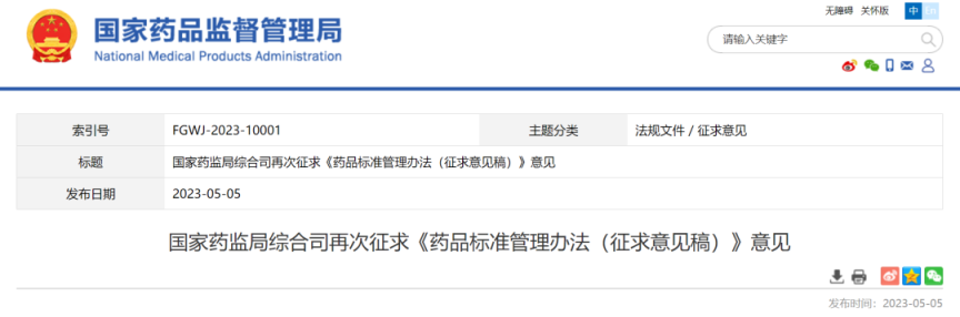 5月5日,国家药监局再次公开征求《药品标准管理办法(征求意见稿)》意见。