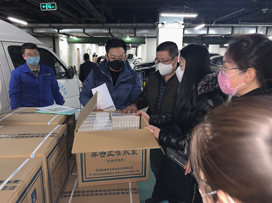 甘肃省红十字会、甘肃省药品监督管理局工作人员,现场对甘肃陇神戎发药业股份有限公司捐赠的药品进行检测并确认。