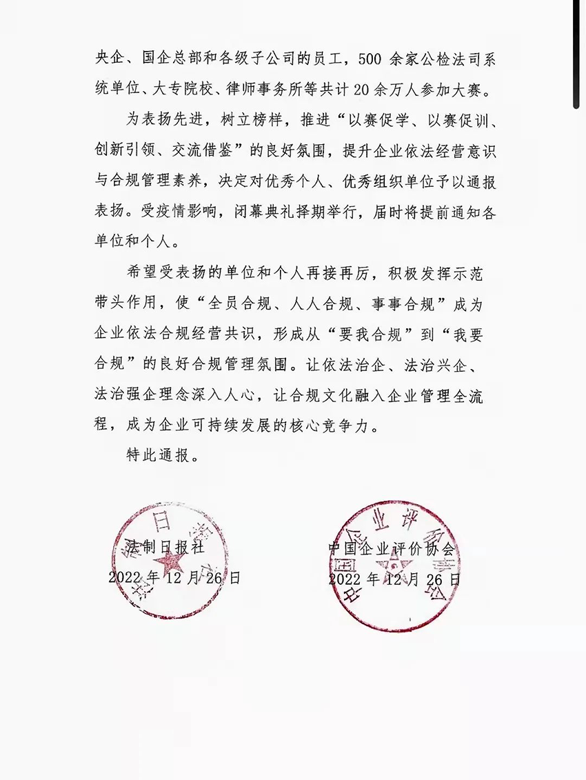 本次大赛由司法部普法与依法治理局、国家市场监督管理总局认研中心、中华全国律师协会共同指导,法治日报社与中国企业评价协会联合主办。2022年10月9日正式上线开赛以来,共有8650家央企、国企参加,500余家公检法司系统单位、大专院校及律师事务所共计20余万人参赛,获得优秀组织单位奖项的100家企业中甘肃药业投资集团有限公司名列第12位。