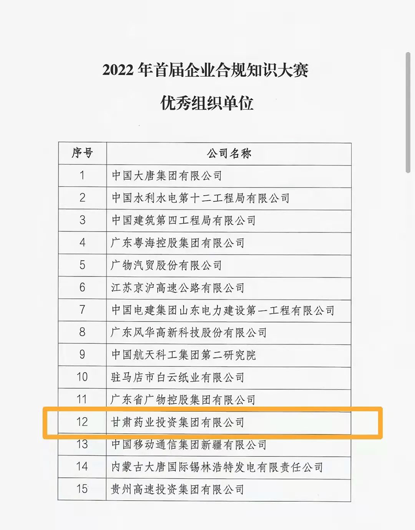 2022年12月26日甘肃药业投资集团有限公司获得由法治日报社及中国企业评价协会颁发的“2022首届全国企业合规知识大赛”优秀组织单位奖。