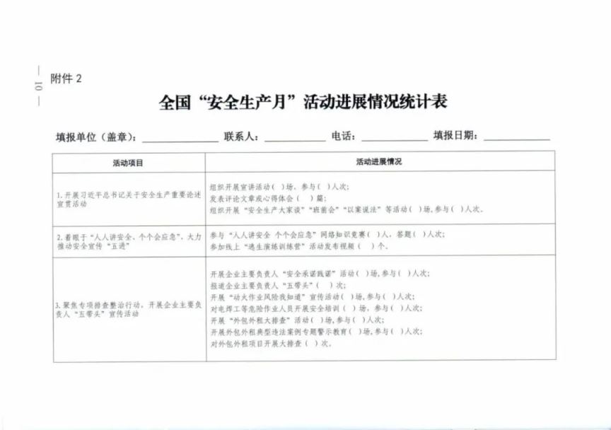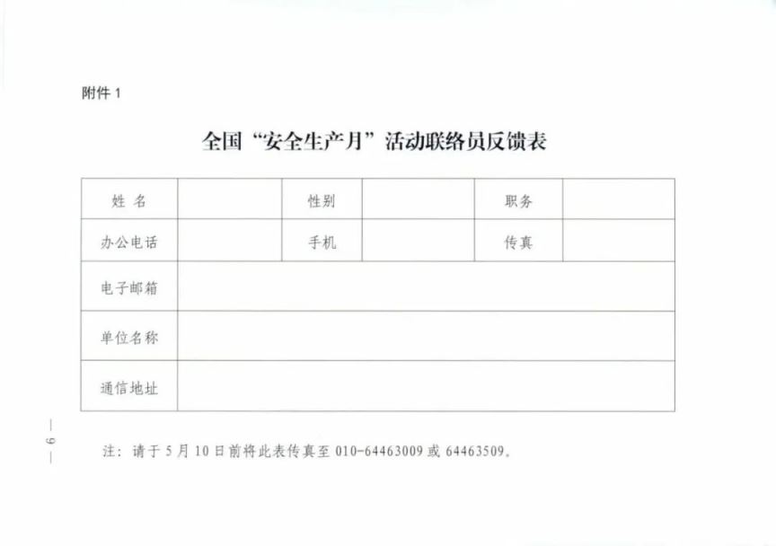 各单位要明确1名联络员于5月10日前反馈并及时报送工作进展情况,请于7月6日前将活动总结报送全国“安全生产月”活动组委会办公室。联系人:李赛、王恋一,010-64463009、64463509(带传真);电子邮箱:anquanyue@qq.com;通讯地址:北京市东城区和平里兴化东里9号楼,邮编:100013。