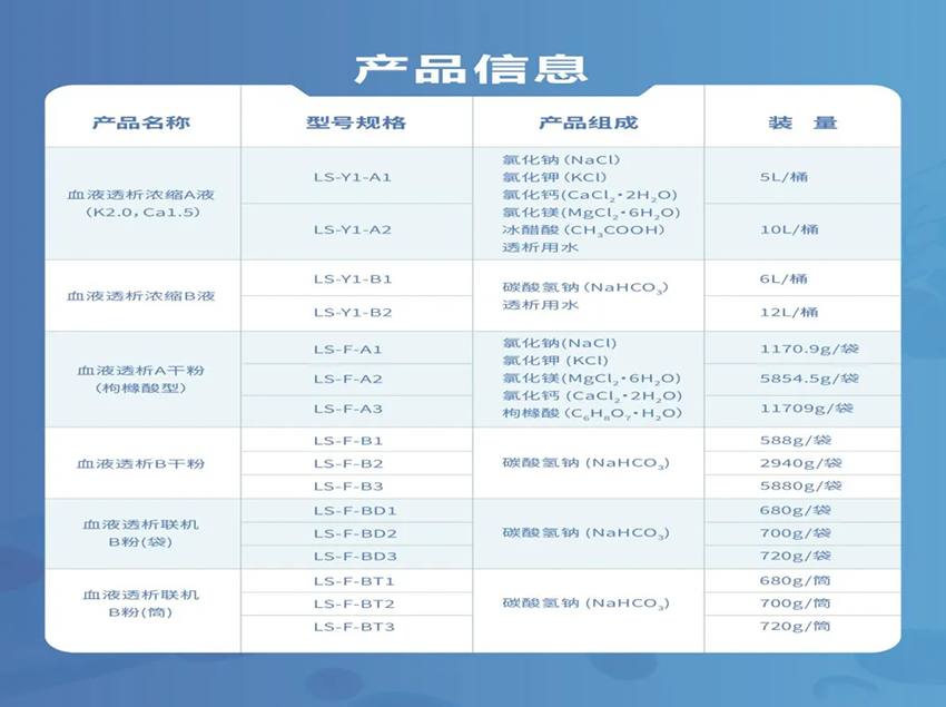 公司申请注册成功的“血液透析浓缩液”和“血液透析干粉”均属于血液透析浓缩物,产品医疗器械分类编码为10-04-01,适用于急性肾衰竭、慢性肾衰竭的血液透析治疗,已被临床大量应用。此次注册通过的产品离子浓度型号为“钾2.0、钙1.5”型,拥有1人份、2人份装量,能满足绝大多数患者与透析中心的使用需求。