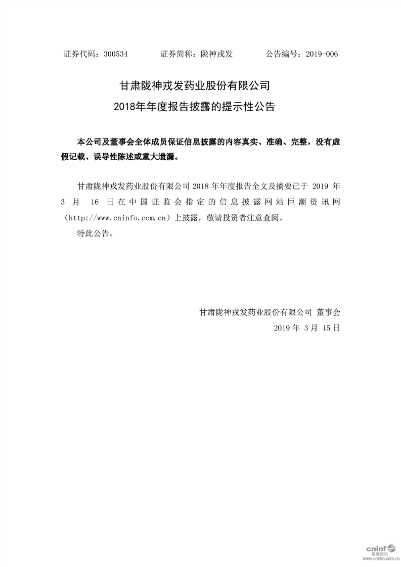 2018年年度报告披露的提示性公告